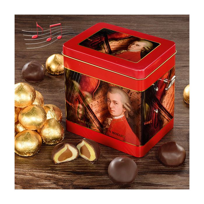 - Mozartkugeln – Die edlen Kugeln bestehen aus einem zarten Kern aus Nougat, umhüllt von Marzipan und ummantelt mit hochwertiger Zartbitter-Schokolade – ein wahrer Genuss für Feinschmecker und Mozart-Fans.