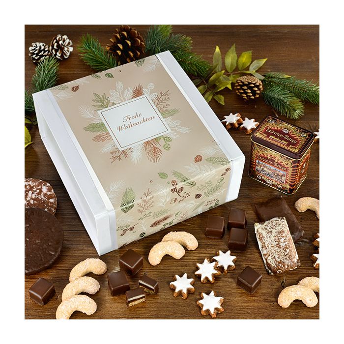 In dieser eleganten Schatulle mit Magnetverschluss und Banderole befinden sich neben einer leckeren Weihnachtsmischung auch eine schöne geprägte Mini-Nostalgie-Dose gefüllt mit Elisen-Lebkuchen.